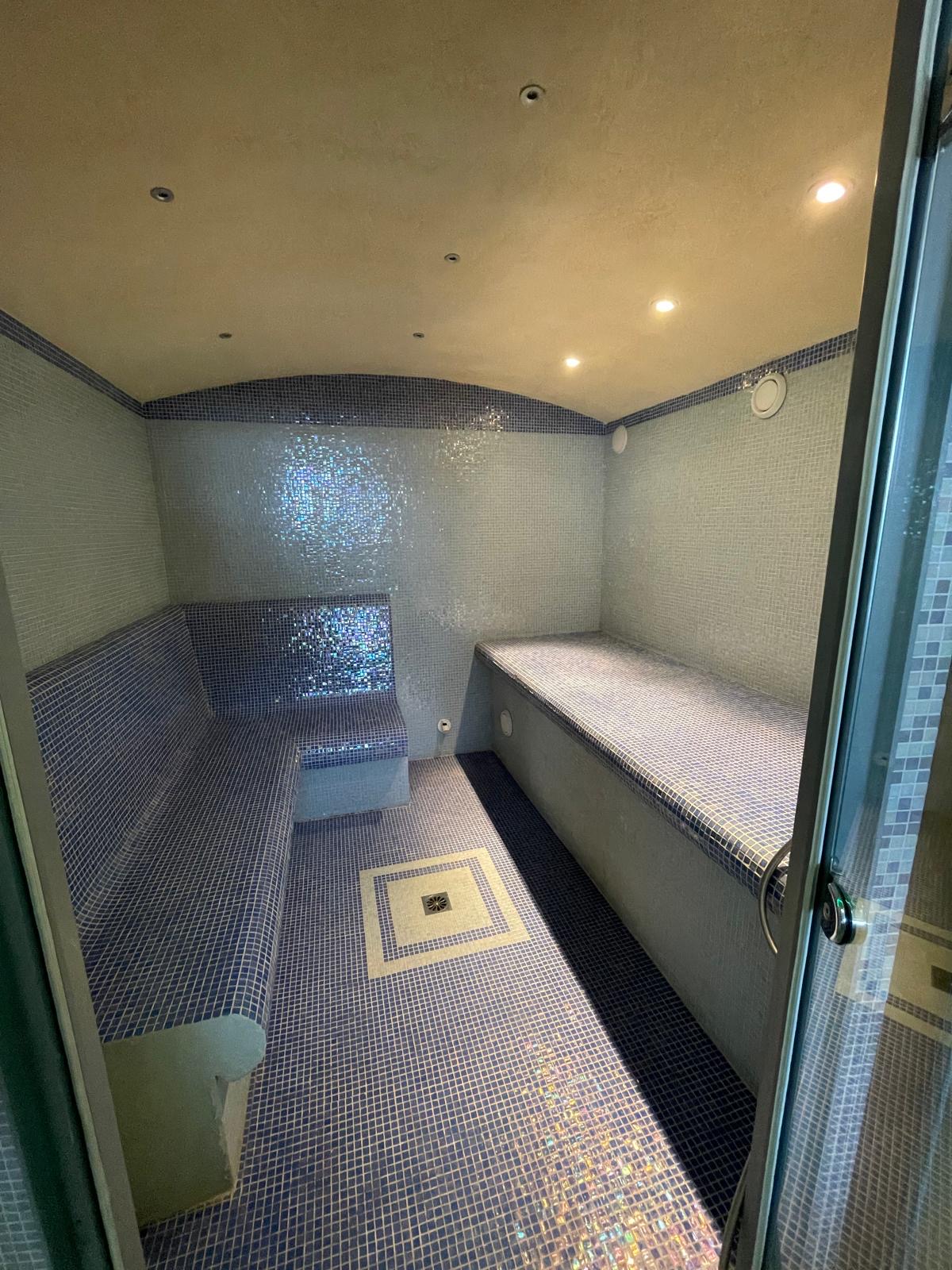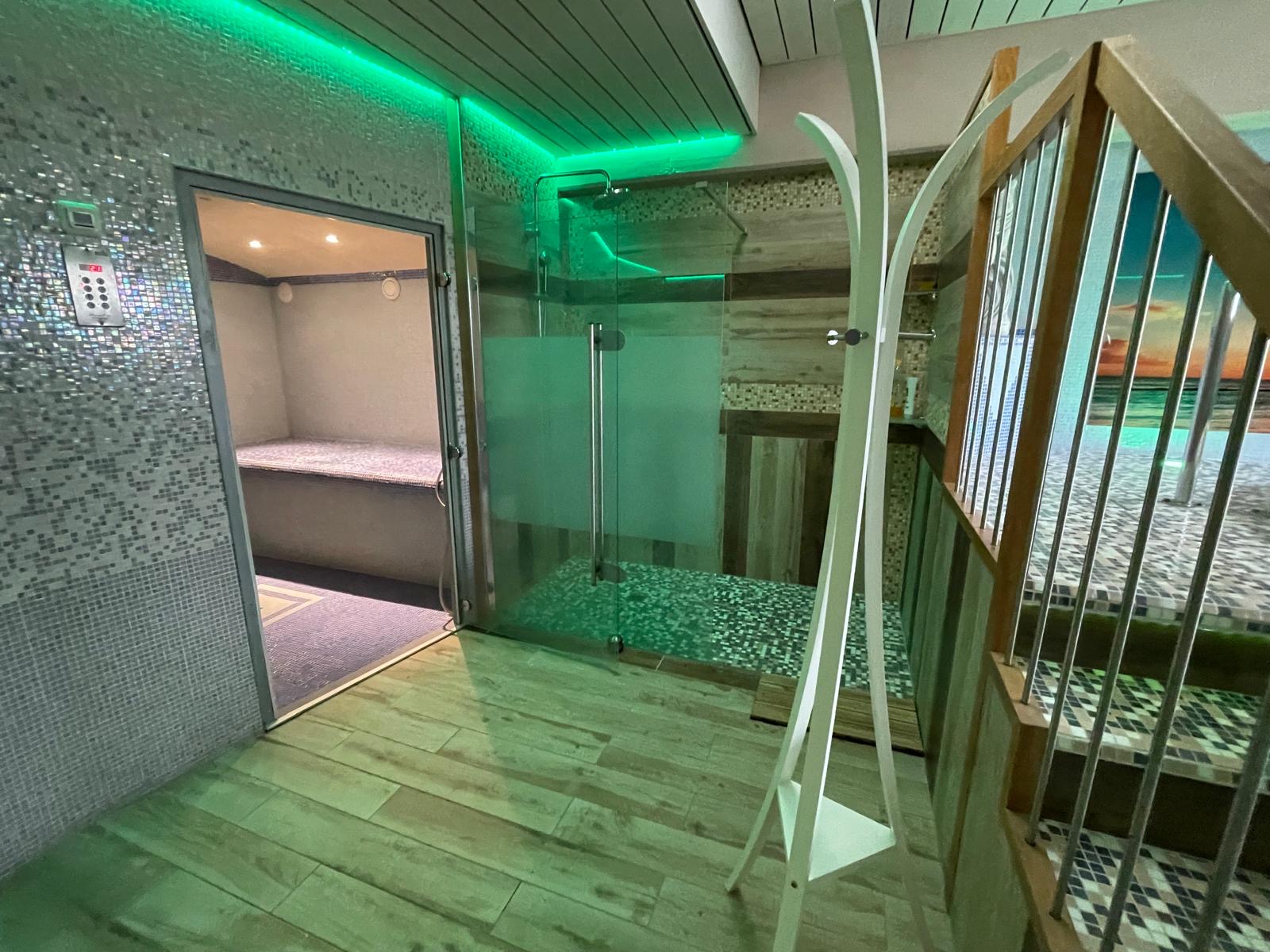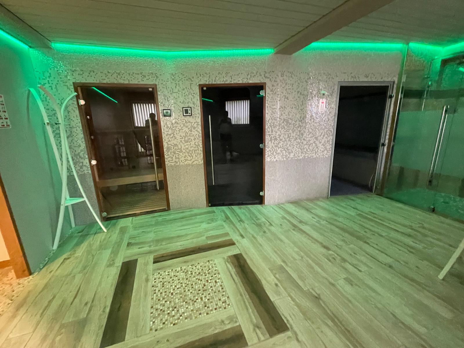 Le véritable espace bien-être privé comprend plusieurs saunas, des douches modernes et un éclairage d’ambiance soigné, créant un lieu de détente exclusif directement à domicile.