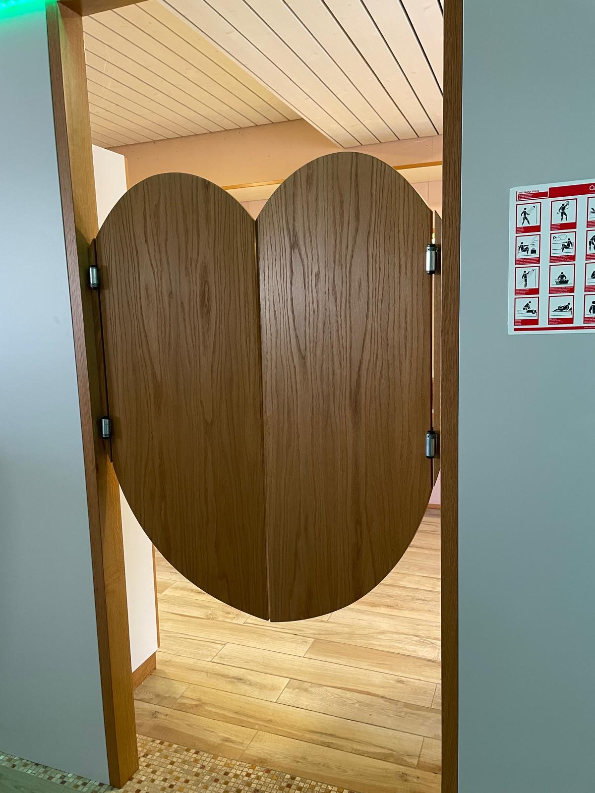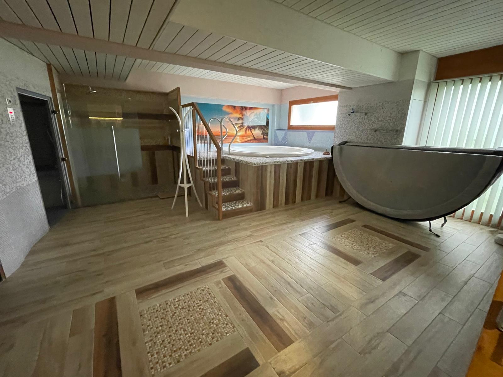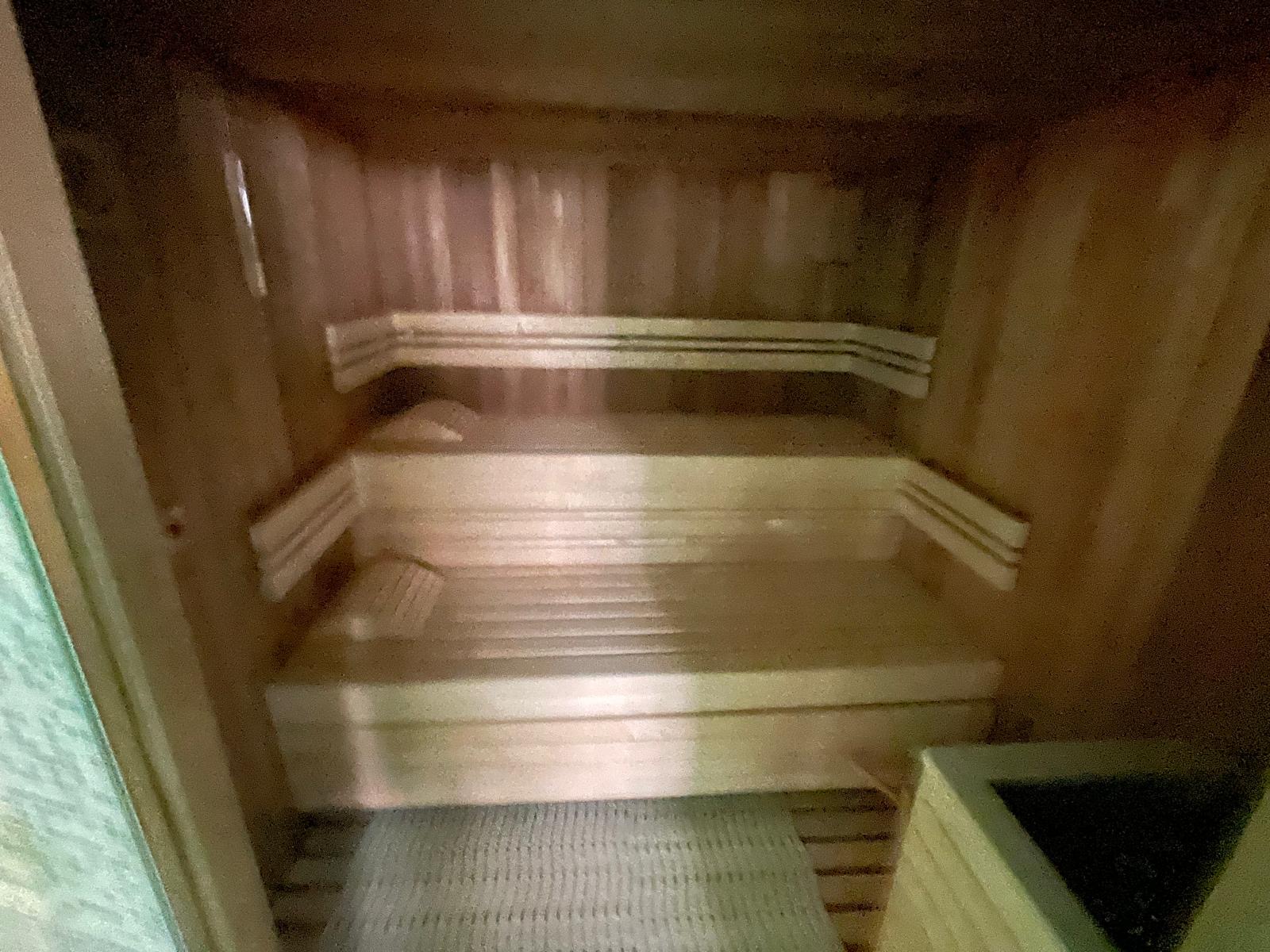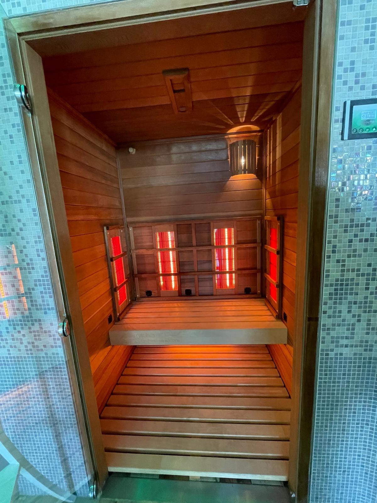 Le véritable espace bien-être privé comprend plusieurs saunas, des douches modernes et un éclairage d’ambiance soigné, créant un lieu de détente exclusif directement à domicile.
